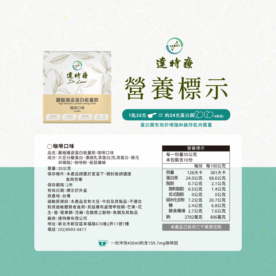 成分|大豆分離蛋白、濃縮乳清蛋白(乳清蛋白、葵花卵磷脂)、咖啡粉、菊苣纖維