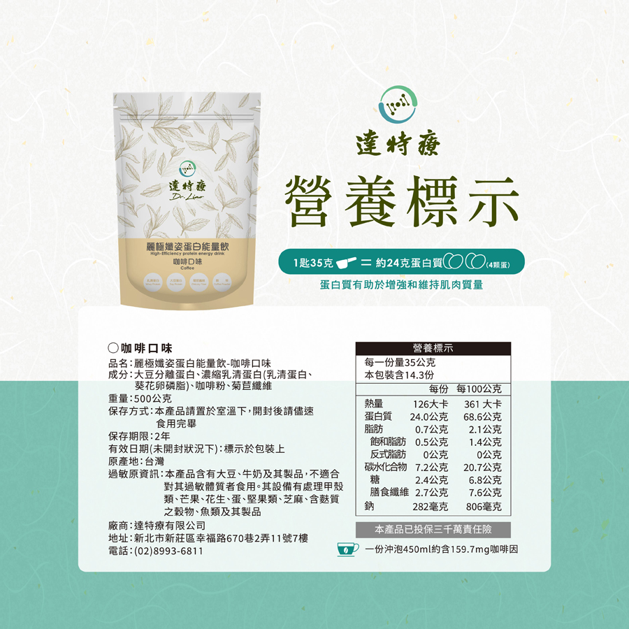 成分|大豆分離蛋白、濃縮乳清蛋白(乳清蛋白、葵花卵磷脂)、咖啡粉、菊苣纖維
