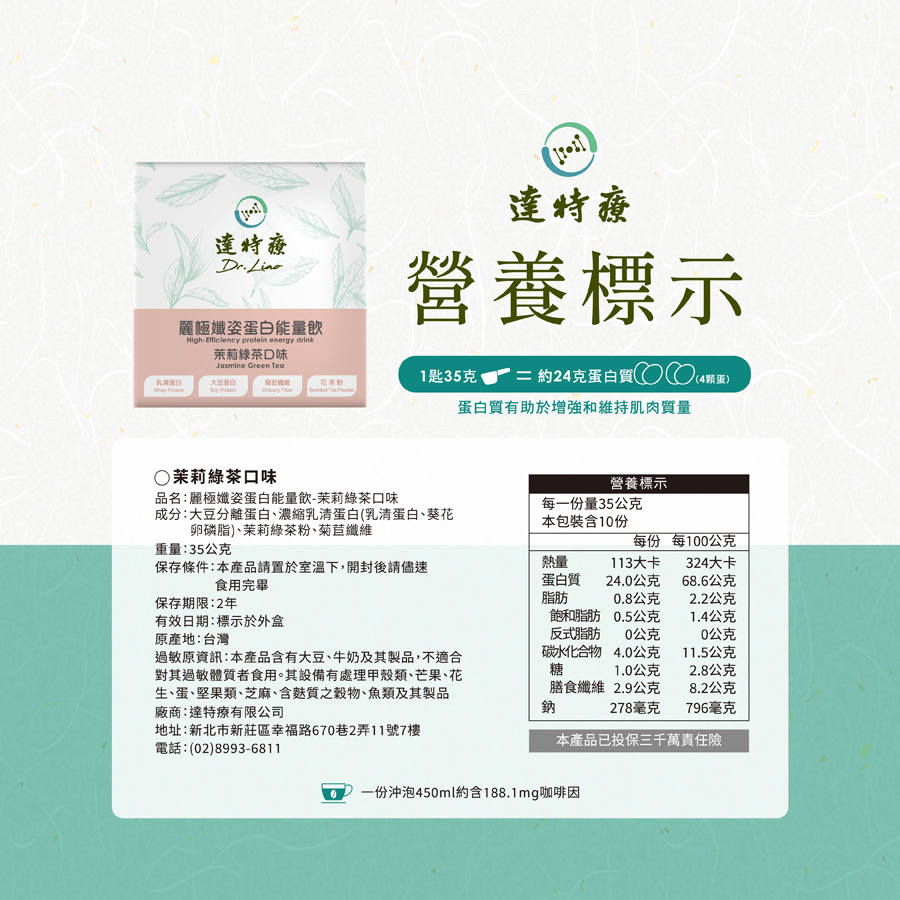 四季春茶:大豆分離蛋白、濃縮乳清蛋白(乳清蛋白、葵花卵磷脂)、四季春茶粉、菊苣纖維。