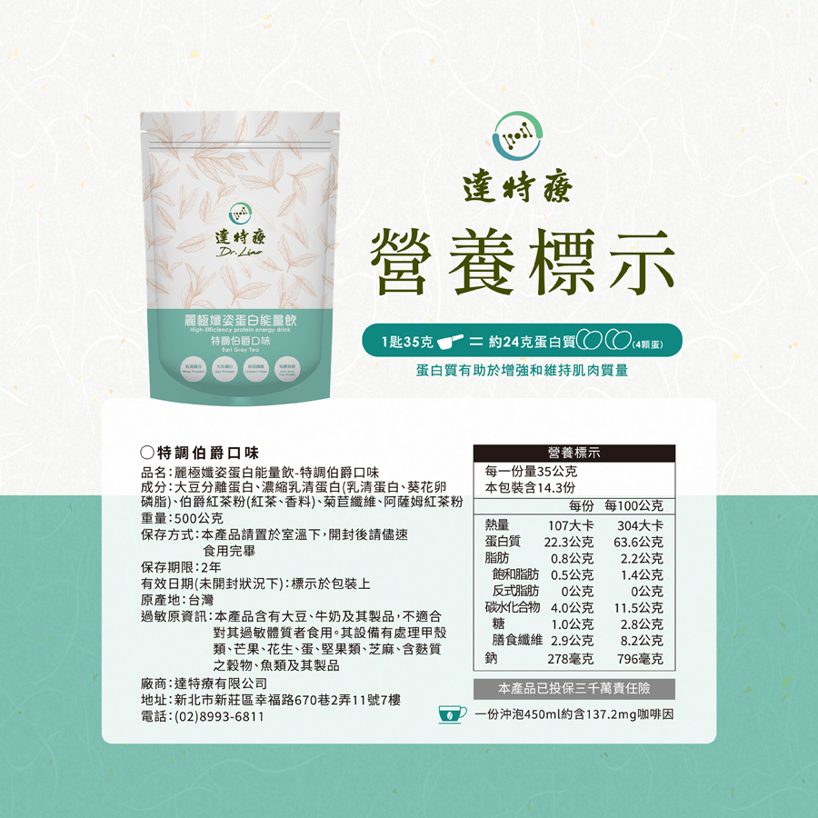 成分|大豆分離蛋白、濃縮乳清蛋白(乳清蛋白、葵花卵磷脂)、伯爵紅茶粉(紅茶、香料)、菊苣纖維、阿薩姆紅茶粉