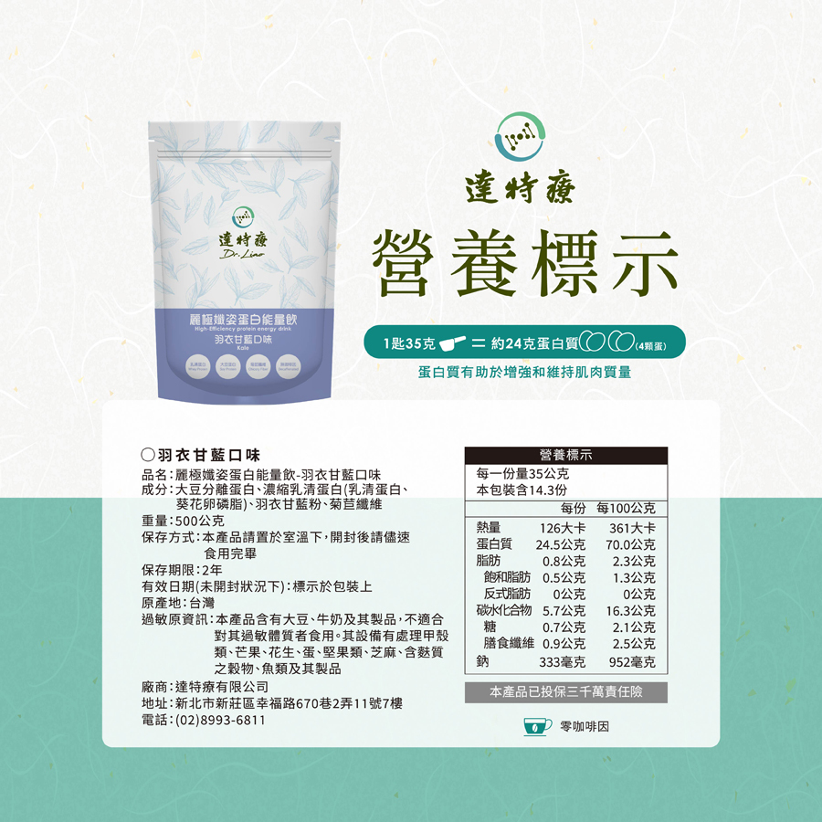 成分|大豆分雞蛋白、濃縮乳清蛋白(乳清蛋白、葵花卵磷脂)、羽衣甘藍粉、菊苣纖維