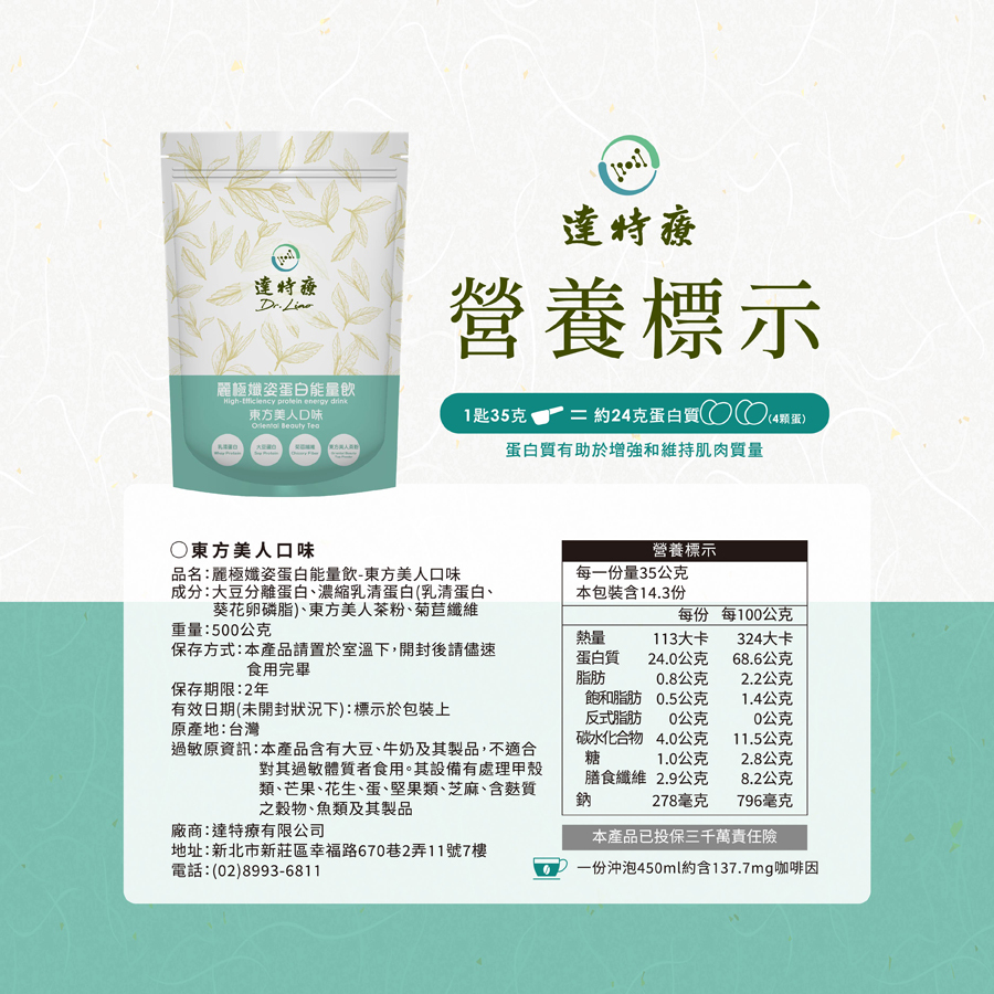 成分|大豆分離蛋白、濃縮乳清蛋白(乳清蛋白、葵花卵磷脂)、東方美人茶粉、菊苣纖維