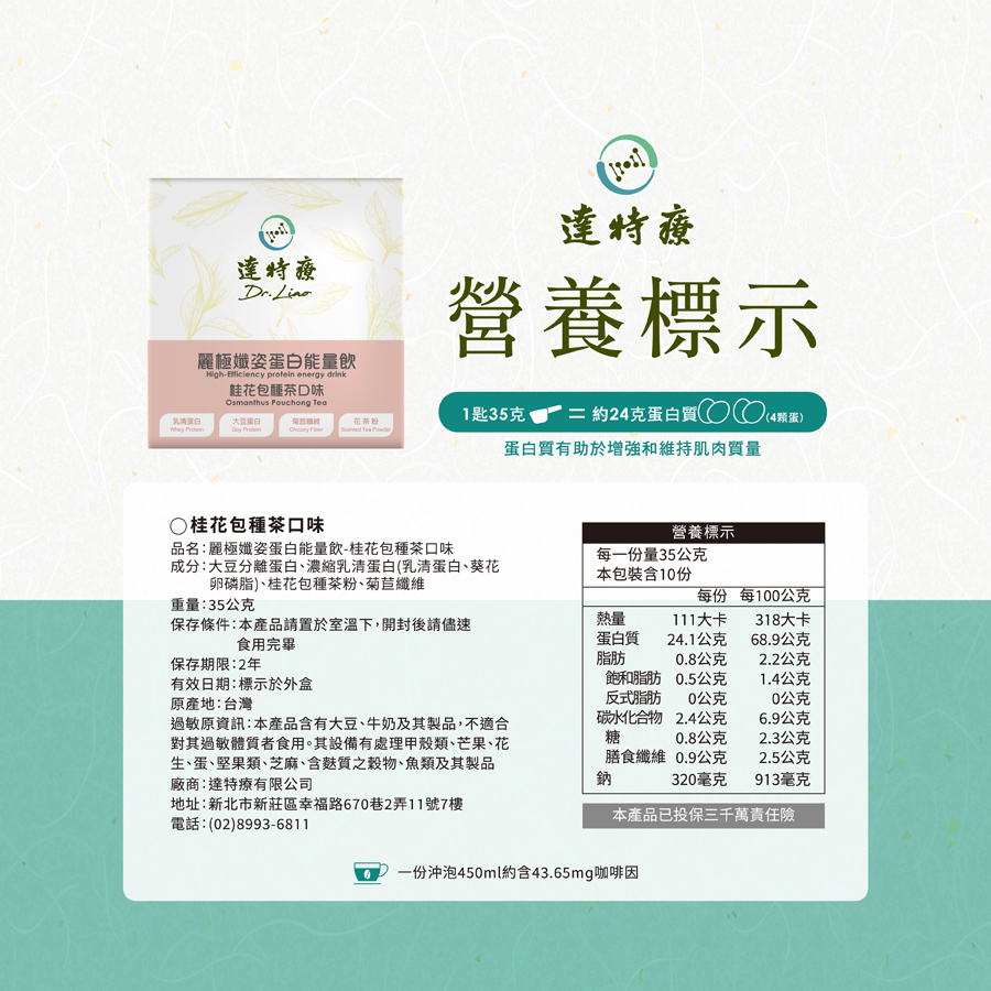 桂花包種:大豆分離蛋白、濃縮乳清蛋白(乳清蛋白、葵花卵磷脂)、桂花包種茶粉、菊苣纖維、桂花粉。